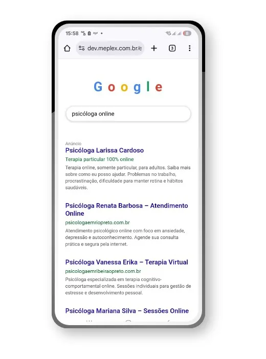 Observe que o primeiro resultado é diferente. É o que chamamos de “patrocinado”. É uma propaganda e está dentro do contexto da campanha de marketing, no caso da profissional Lari. Quem está vendo essa propaganda? Um usuário, especificamente aquele que fez a busca por “psicóloga online”. Assumimos aqui que esse usuário fez tal busca porque acredita que precisa de psicoterapia. Se também assumirmos que esse usuário se interessou, ele acessará o link e receberá a página profissional da Lari. Dentro desse contexto, temos, então, que essa é a página de aterrissagem que aparece no navegador do dispositivo do usuário, trazendo uma experiência comunicativa, como a ilustração abaixo: