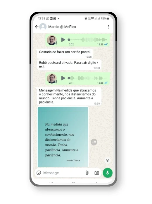 Case: Weplex Whatsapp-based assistant helped this user case, Marcio the author, to create a digital postcard graphic image. This image follows his site colors, site style - supports his brading. This author knows that all images are kept in his site database. This support his advancement as a author, supports sharing, in a consistant way.