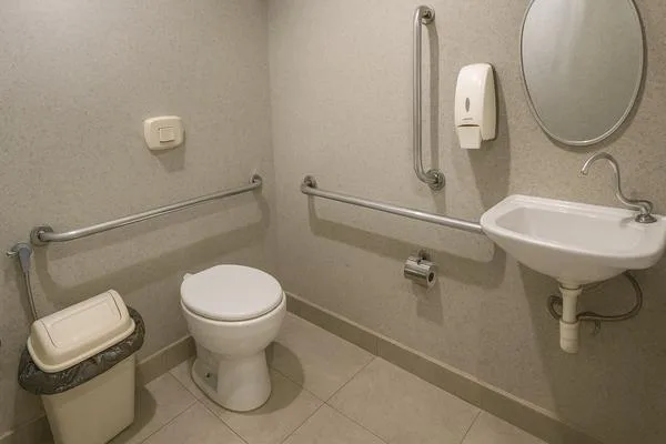 O exemplo abaixo também é uma foto que traz a ideia de profundidade sobre esse banheiro que por sinal, logicamente, traz recursos de acessibilidade: