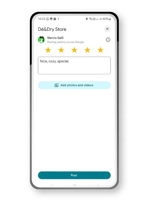 Era aquele antigo "boca a boca", sabemos. Mas agora, também sabemos, muita coisa está no digital. Nosso cliente, a Dé&Dry Store, também sabe disso. Uma coisa, sobre o Google Maps, é mostrar a localização da loja. Mas mais do que isso, elas sabem também que a presença no Google Maps traz uma percepção sobre as avaliações dos usuários. É por isso que a Dé&Dry Store já começou uma campanha sobre o assunto - e já tem suas primeiras avaliações.