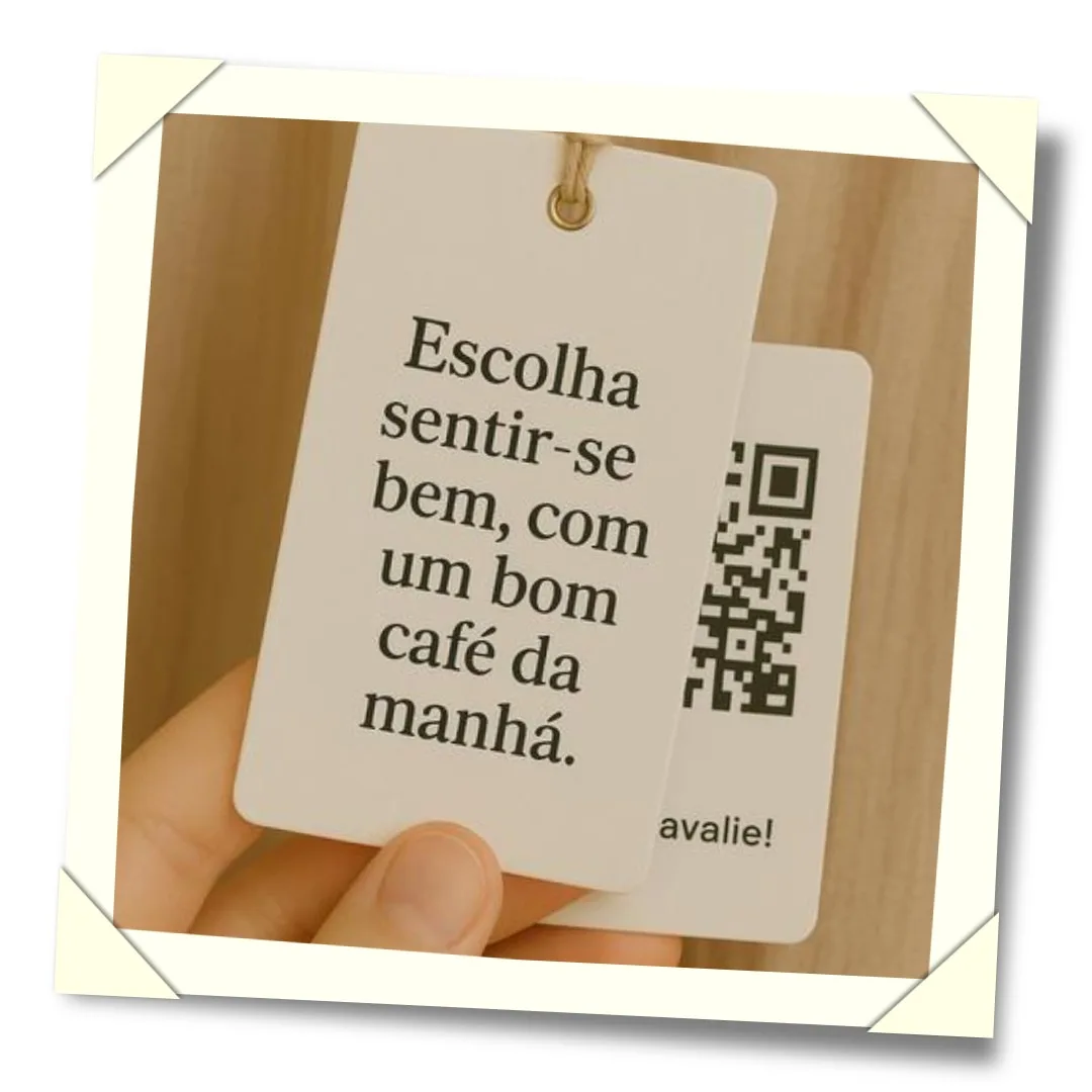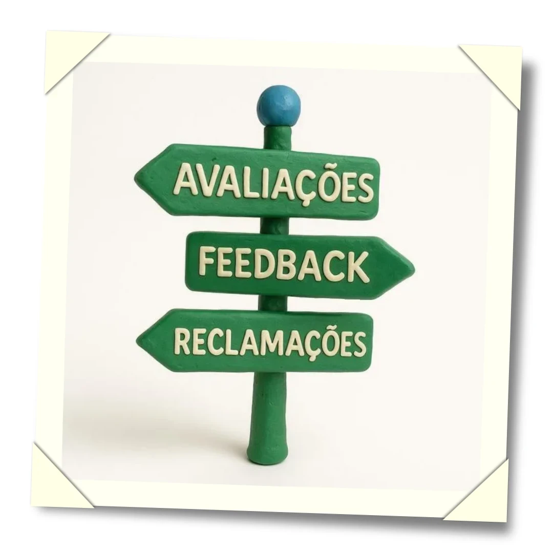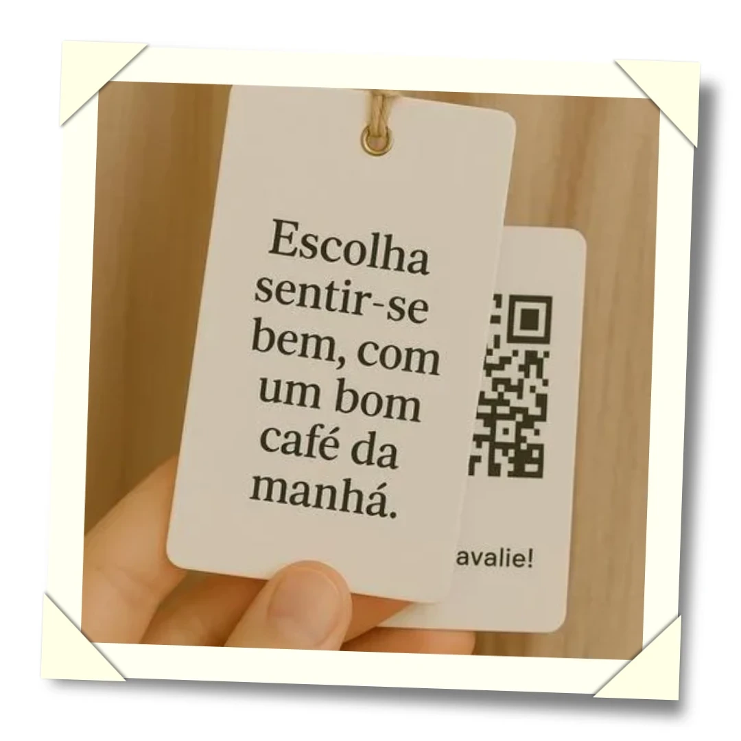 Idealizamos um "display" para ficar na loja. Neste caso fizemos assim por algumas razões. Porque é mais suave, indireto. Mas também para carregar - de cara - aquele lembrete de que trata-se de uma avaliação pública.