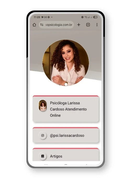 A experiência "bio links" pode ser entendida como um site simples que traz um mapa, como um menu. Nesta página, o profissional pode criar vários caminhos - como botões - como no exemplo da psicóloga Larissa Cardoso. Saiba mais sobre A relação entre o 'link da bio' do Instagram e sua página de destino.